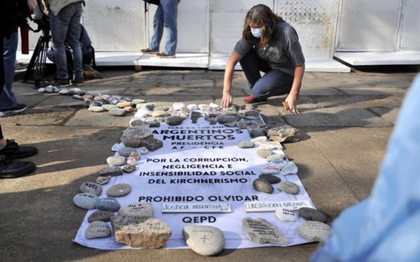 Ciudadanos autoconvocados recordaron a familiares y amigos fallecidos en el último año y medio depositando una piedra frente a la Casa Rosada y la Quinta Presidencial. Ocurre en medio de la polémica por la foto del cumpleaños