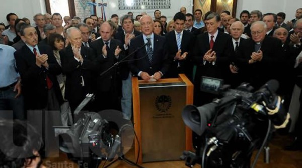 El gobernador dijo que esperan una respuesta de la propuesta salarial realizada a la policía. Habló en Casa de Gobierno en Santa Fe acompañado por intendentes, legisladores y fuerzas vivas en un acto en defensa de las instituciones.