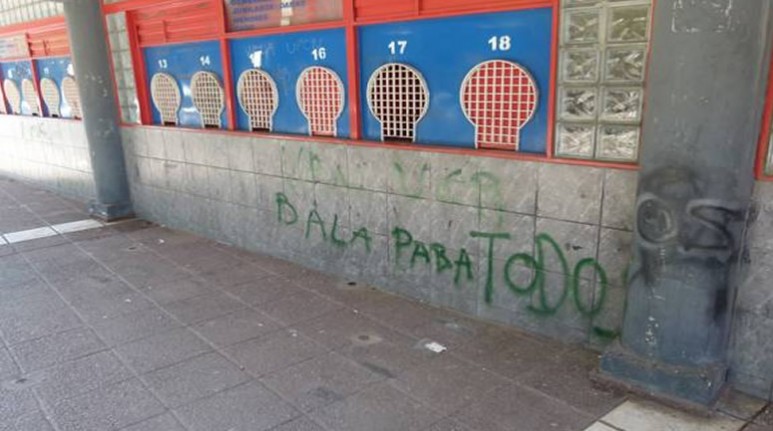 En la mañana de este viernes aparecieron pintadas algo intimidatorias, en la zona de las boletrías del club Unión, sobre calle Cándido Pujato.