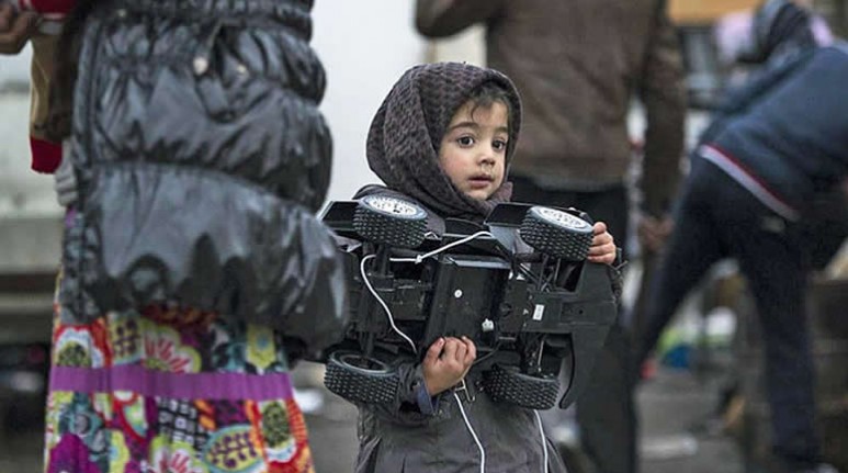 Niña sostiene un juguete mientras la policía desmantela el campamento gitano en Saint Ouen, cerca de París