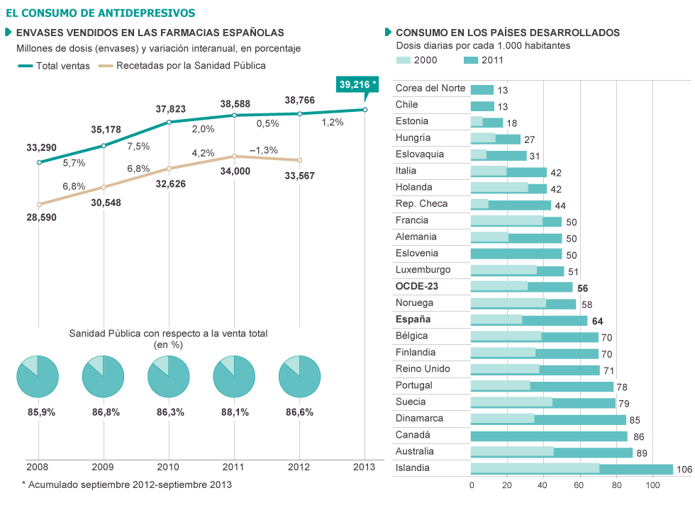 El consumo de antidepresivos se ha disparado en España. Desde que se extendió el diagnóstico de la depresión y su prescripción en los centros de atención primaria en la década de los noventa, el uso de estos fármacos ha vivido una escalada constante. Su uso se ha doblado en una década. De las 30 dosis diarias por cada 1.000 habitantes registradas en el año 2000 se ha pasado a 64 en 2011, según los últimos datos de la OCDE. Y si ese incremento había sido progresivo —desde el gran salto provocado por la aparición y la popularización de medicamentos como la fluoxetina a finales de los ochenta—, desde el inicio de la crisis la escalada ha sido algo mayor. Entre 2008 y 2009 la venta en las farmacias de antidepresivos aumentó un 5,7%, y entre 2009 y 2010 un 7,5%; hasta los 37,8 millones de envases, según datos de la consultora de referencia del sector IMS Health. En 2012 se superaron, con mucho, los 38 millones.