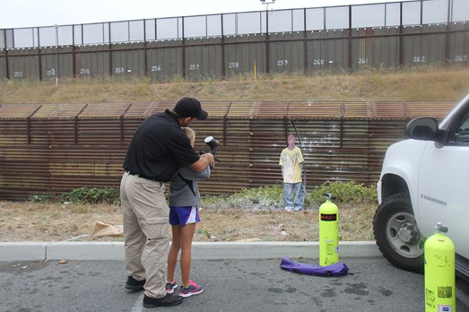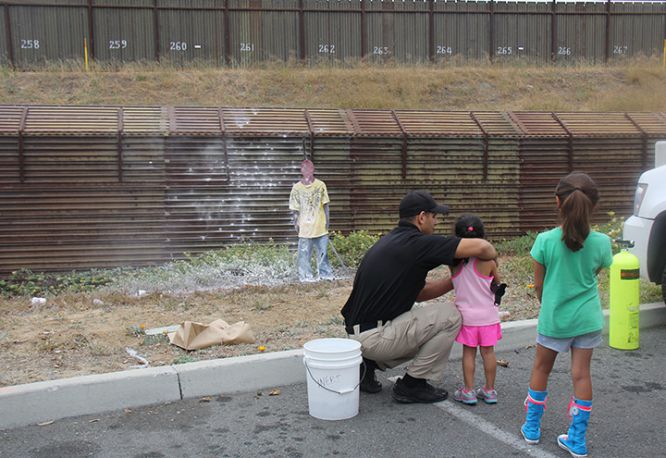 La actividad consiste en mirar a la doble valla que separa Estados Unidos y México, apuntar el arma y disparar bolas de pintura. El objetivo es una silueta de hombre vestida con unos pantalones anchos y una camiseta, que los activistas denuncian que semeja a un migrante que acaba de cruzar ilegalmente a suelo americano. El entretenimiento para niños formó parte de la celebración que la Fundación Roberto J. Duran, creada por varios agentes fronterizos en memoria del agente Duran, fallecido en 2002, realiza desde hace 10 años en la zona fronteriza de San Ysidro (California) para recordar a los agentes caídos.