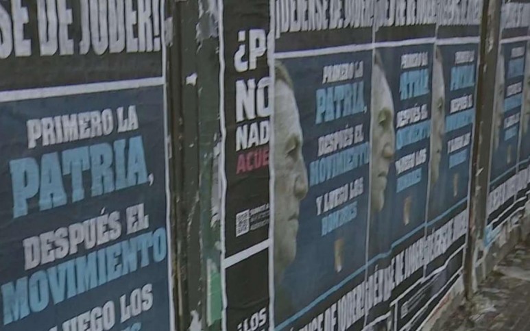 Horas más tarde, una de las cuadras cercanas al Congreso nacional, sobre la avenida Rivadavia, amaneció tapada por carteles dirigidos al Ejecutivo. Con la imagen y una fuerte frase del expresidente Perón, enviaron un mensaje contundente. ““Primero la Patria, después el movimiento y luego los hombres”, dicen en letras mayúsculas.