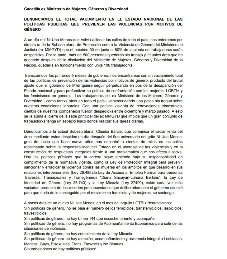 En el mismo texto, que lleva la firma de Nani Smith -Secretaria de Comunicación del exMinisterio y dle Consejo Directivo de ATE Capital- y Fernanda Fuentealba -Secretaria General ATE MinGéneros-, sostienen que el Estado nacional está llevando adelante un "vaciamiento total de las políticas de prevención de las violencias por motivos de género" en medio del ajuste y busca profundizar su "política de confrontación" con mujeres, LGBTI+, feminismos y disidencias.