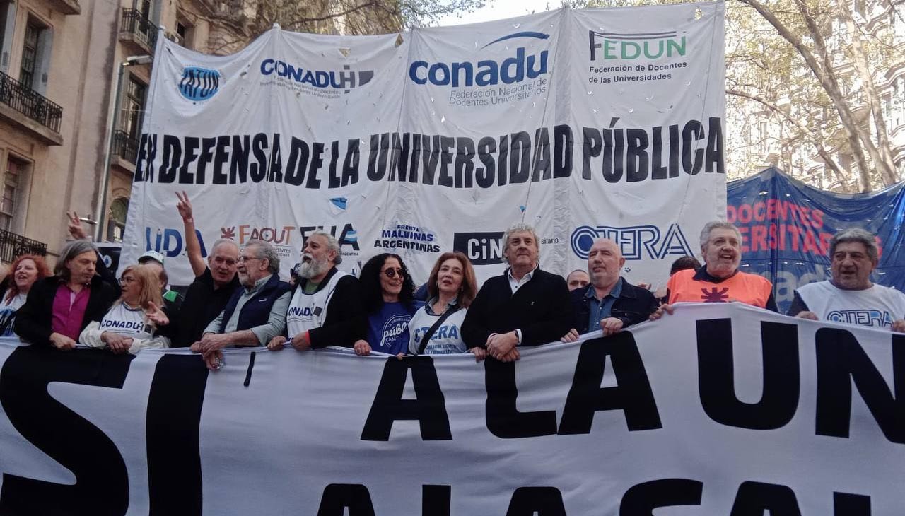 En la imagen se puede ver la bandera sindical docente en defensa de la universidad pública
