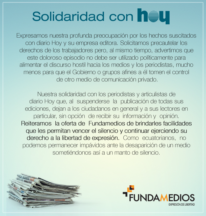 Volviendo a la libertad de prensa en Ecuador, Palacio afirma que en materia de persecuciones y restricciones "el campeonato lo ganó Cuba pero el vice lo compartimos entre Ecuador y Venezuela". Y agrega: "La situación actual es límite en Ecuador. El martes cerraron el diario Hoy, constantemente obligan a los medios a rectificar y publicar disculpas, los diarios no saben qué publicar porque después vienen multas y la mayoría de los medios está en manos del Estado", concluye.