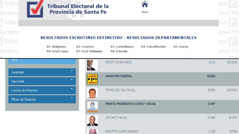 Mientras el conteo de las actas avanza en Santa Fe, la web oficial dio a conocer los números finales de ocho departamentos. La principal diferencia con el provisorio, en la comparación de esos distritos, es que Perotti pasa a Lifschitz como el segundo más votado. Algo que puede cambiar cuando se carguen las mesas de Rosario y el resto de la provincia