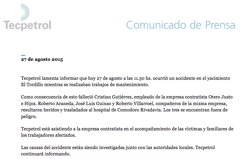 La petrolera confirmó esta tarde, en un comunicado, que el fallecido se llama Cristian Gutiérrez, y que los heridos fueron trasladados al hospital de Comodoro Rivadavia.