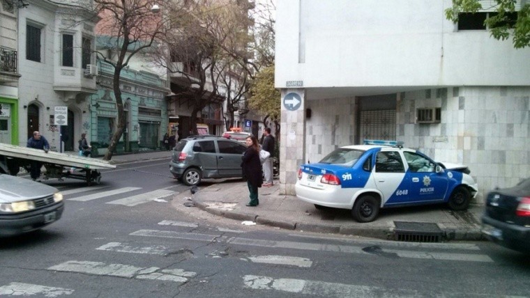 Un patrullero de la Policía de Santa Fe y un Volkswagen Fox chocaron este sábado a la mañana en la esquina céntrica de San Lorenzo y Dorrego. Los dos vehículos subieron a la vereda y terminaron impactando contra el frente de un edificio. No se registraron heridos.
