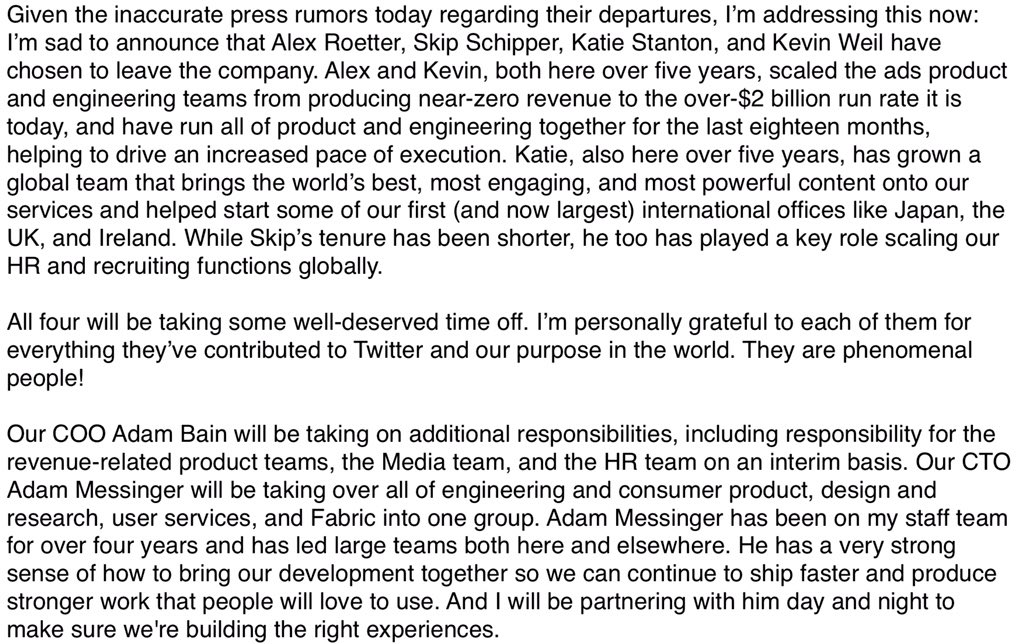 Los ejecutivos que dejaron sus puestos son: la jefa de la sección de medios, Katie Jacobs Stanton, el director de productos, Kevin Weil, el responsible de la división de ingeniería, Alex Roetter, y el encargado de recursos humanos, Brian "Skip" Schipper.