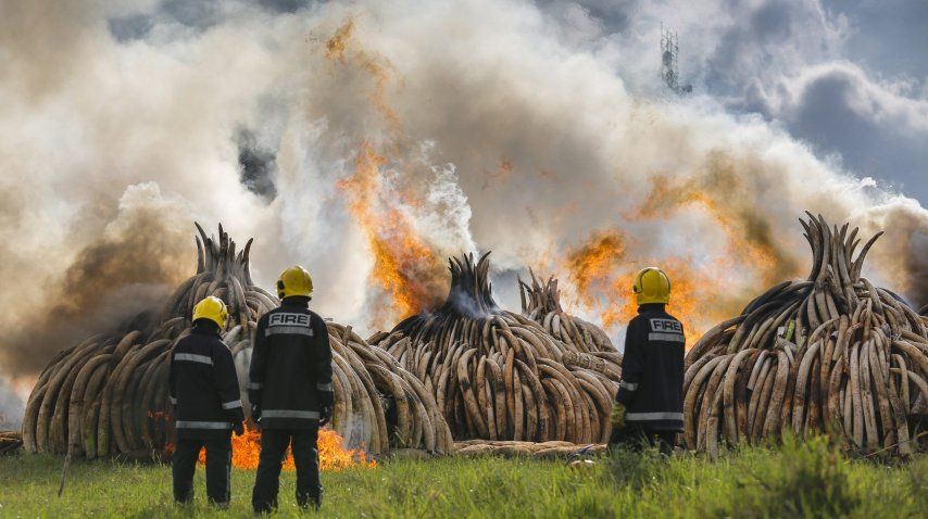 El presidente de Kenia, Uhuru Kenyatta, lideró este sábado la quema de 105 toneladas de marfil y 1,35 de cuerno de rinoceronte que fueron confiscados por las autoridades a cazadores furtivos. El acto fue una declaración de guerra contra el tráfico del llamado "oro blanco", que cada año mueve 200 millones de dólares en África.