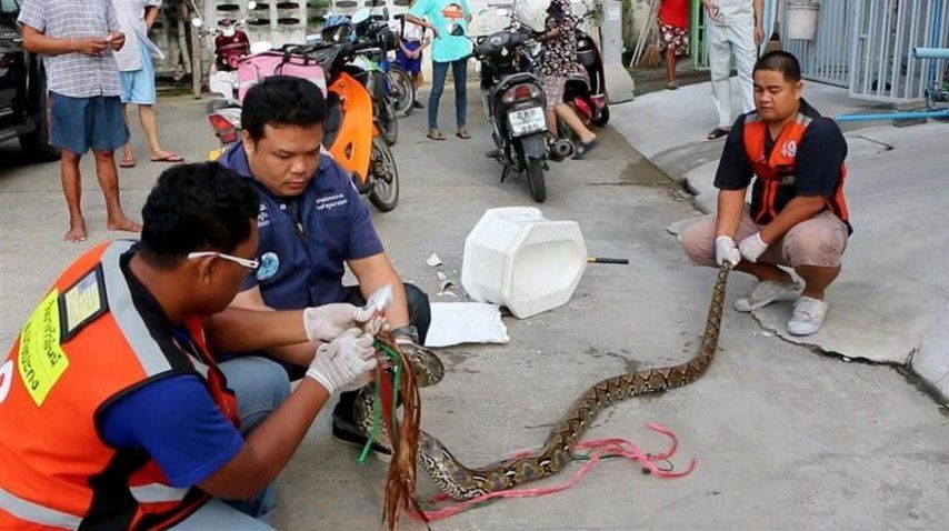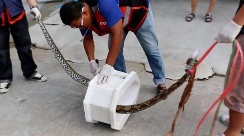 Trabajadores de emergencias desmantelaron el inodoro de estilo asiático, con el pitón aún enroscado a lo largo del mismo. La serpiente fue retirada e iban a ponerla en libertad nuevamente, según un trabajador de emergencias citado por el periódico Thai Rath.