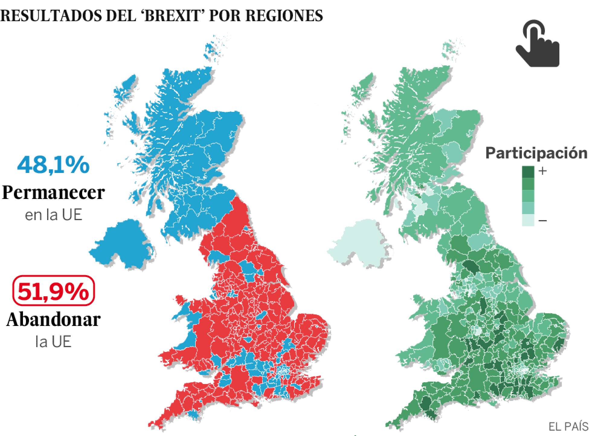 Reino Unido ha votado por abandonar la Unión Europea en el histórico referéndum celebrado este jueves, con un 51,9% de los apoyos para el Brexit, por un 48,1% de papeletas en favor de la permanencia. La decisión de los británicos desencadena una histórica caída de la libra esterlina y de los mercados bursátiles europeos, coloca a la Unión Europea ante un desafío sin precedentes y sume a Reino Unido en el territorio de los desconocido. Inglaterra y Gales apoyaron mayoritariamente la salida de la UE, mientras que Londres, Escocia e Irlanda del Norte optaron por la permanencia. Ante la crisis abierta en el país, el primer ministro, David Cameron, ha anunciado que dejará su puesto tras el congreso de su partido en octubre.