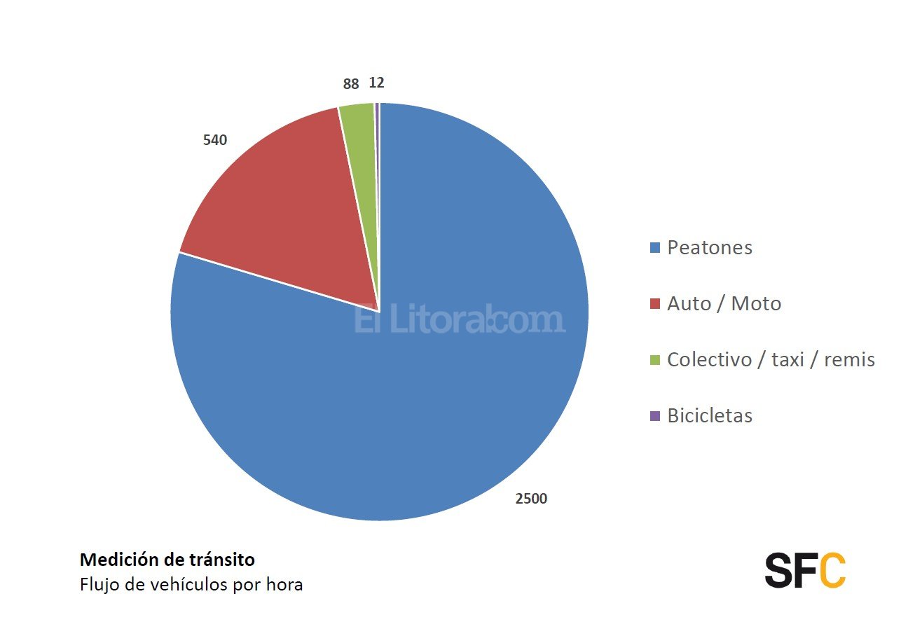 Según los estudios expuestos hoy por la Municipalidad, por hora pico circulan en este sector de la ciudad un promedio de 2.500 peatones, 88 colectivos, taxis y remises, 12 bicicletas, 540 autos y motos.