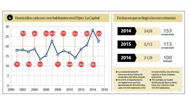 En nueve meses del 2016, la cifra de asesinatos en el departamento La Capital trepó a 100 y la situación parece no calmar. El uso incontrolable de armas de fuego demuestra que la ciudad de Santa Fe y alrededores presenta un alarmante panorama.
