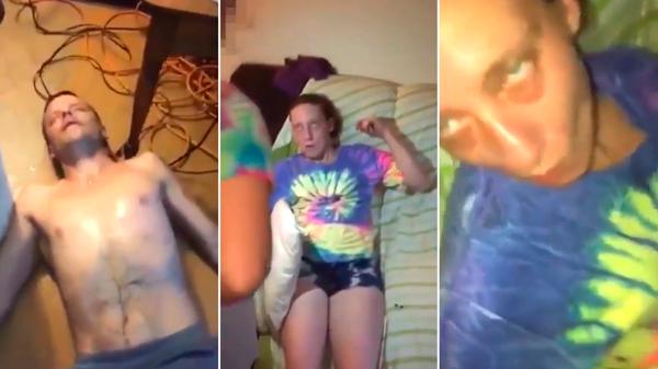 La pareja está tendida frente al aparato de televisión, sin poder reaccionar ante los estímulos de ambos, que decidieron transmitir en vivo por su cuenta de Facebook lo que vivían. El estado de ambos es tan calamitoso que el padre incluso no ofrece resistencia cuando su pequeña le da numerosos puntapiés para que responda.