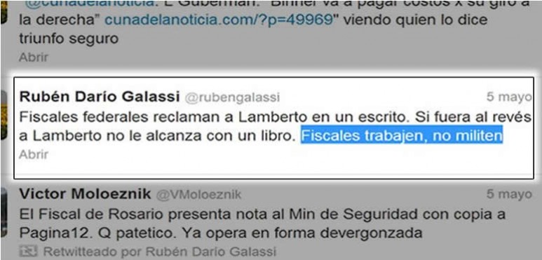 Galassi escribió textualmente en su cuenta de Twitter: “Fiscales federales reclaman a Lamberto en un escrito. Si fuera al revés a Lamberto no le alcanza con un libro. Fiscales trabajen, no militen”.