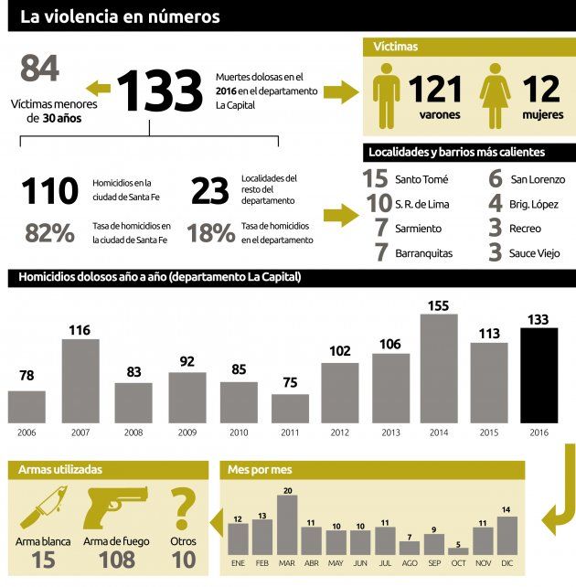 El primer análisis que surge de los 133 homicidios dolosos ocurridos entre el 1° de Enero y el 31 de diciembre de 2016 es que la cifra de los 133 homicidios es la segunda en importancia en toda la historia del departamento La Capital, solamente superada por los 155 asesinatos ocurridos durante 2014.