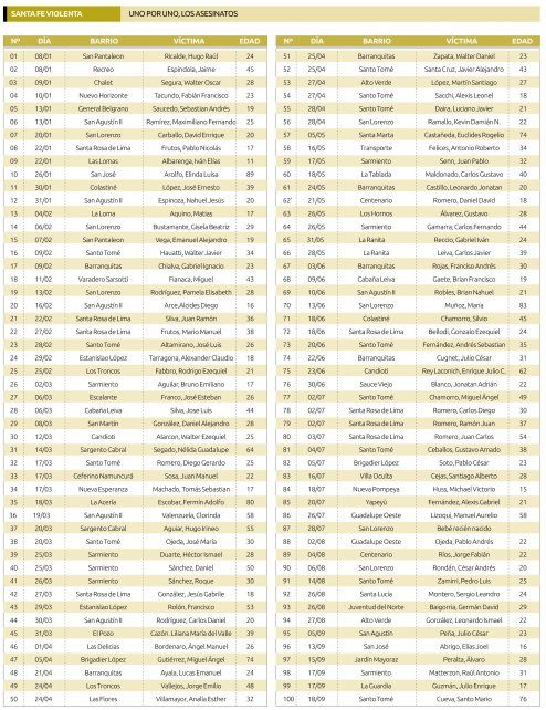Diario UNO de Santa Fe, desde el año 2006, realiza el resumen de los homicidios año a año, como elemento de análisis social en el delito que atenta contra el bien más preciado: la vida. Siendo Santa Fe, en las dos últimas décadas, uno de los distritos más violentos del país en la relación de crimenes y cantidad de población.