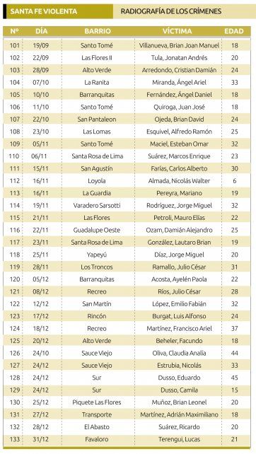 Pero hay dos datos que confirman la radiografía de la violencia en el departamento La Capital en general, y en la ciudad de Santa Fe en particular, ya que el 63 por ciento de las víctimas de los homicidios tenían 30 años o menos, siendo 72 de esas víctimas personas que iban dese los 18 a los 30 años, lo que evidencia cuál es la franja etaria con más conflictos. Además cuenta con una información correlativa y complementaria, y que 108 de los asesinatos fueron perpetrados con arma de fuego, lo que equivale a más del 80 por ciento de los homicidios.Mientras que otros 15 asesinatos fueron cometidos con todo tipo de armas blancas, y otros 10 se produjeron con otro tipo de objeto contundente.