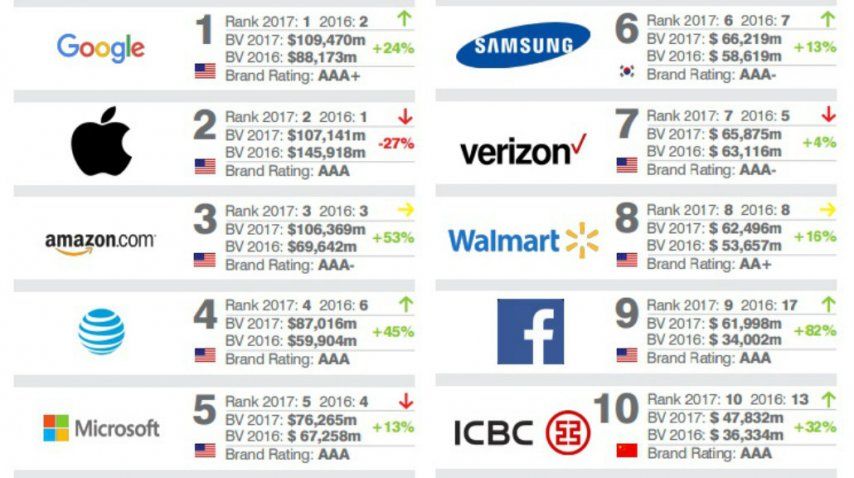 Alphabet, la empresa madre de Google, construyó un valor de US$ 109.470 millones para la marca y la hizo saltar desde el segundo puesto al primero. En 2016, el buscador había registrado un valor de US$ 88.173 millones contra los US$ 145.918 millones de Apple.
