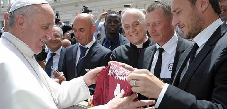 El capitán de La Roma, Francesco Totti, entrega una camiseta del equipo al Papa Francisco tras la audiencia general