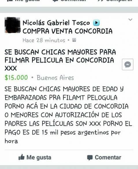 La convocatoria se realiza a través de publicaciones de Facebook, hechas por una persona que dice llamarse Nicolás Gabriel Tosco, quien convoca a "chicas mayores de edad, embarazadas o menores con autorización de los padres" para filmar una película XXX en Concordia, indicó Análisis.