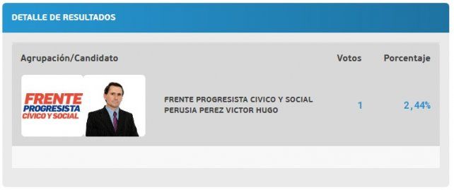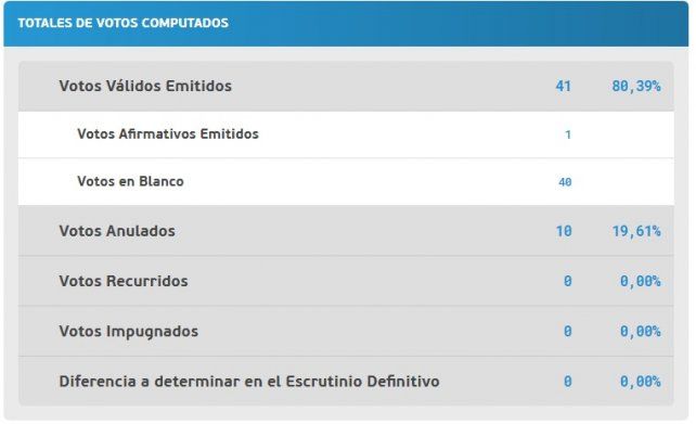 El fin de semana votaron 51 personas, de los cuales 10 anularon su voto. Los 41 restantes fueron votos válidos emitidos: 40 fueron en blanco y el único voto restante fue afirmativo. Difícil de creer, pero ese voto fue ni más ni menos el que lo catapultó a la victoria a Víctor Hugo Perusia Pérez.
