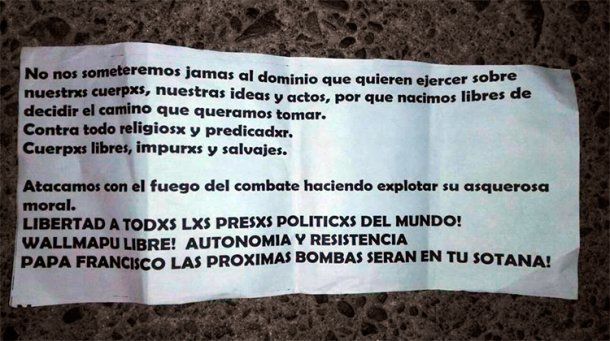 "Papa Francisco, las próximas bombas serán en tu sotana", dice un panfleto encontrado en una de las tres iglesias atacadas esta madrugada en Chile.