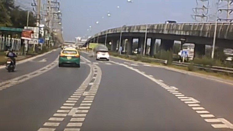 No, no era un plato volador. Un video filmado en la provincia de Pathum Thani, en Tailandia, muestra cómo una tapa de un tanque cisterna casi aplasta un auto que circulaba por una autopista.