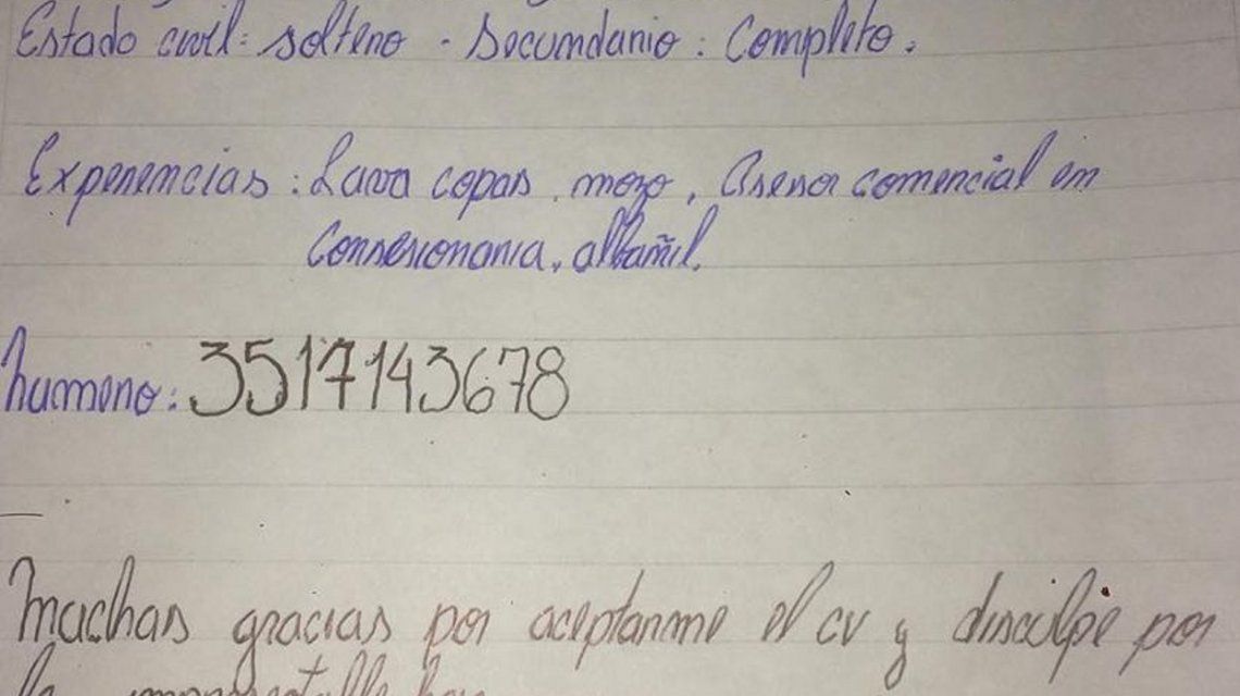 Córdoba: consiguió trabajo el joven que presentó un CV escrito a mano