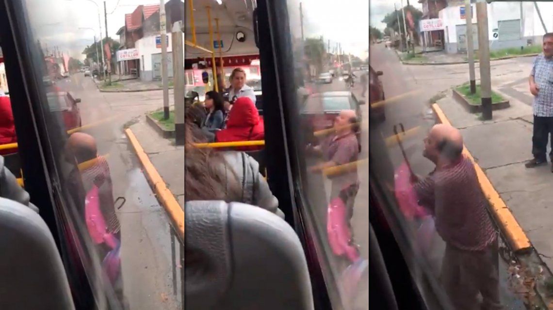 Como se puede ver en la grabación, el hombre cruza al colectivo con su auto, luego se baja y va hasta la ventanilla del asiento donde estaba su ex mujer y comienza a gritarle y pegarle al colectivo con un bastón para que ella se baje.