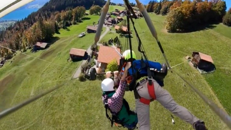 Un turista estadounidense de visita en Suiza se arriesgó a lanzarse por primera vez en ala delta, y tuvo que volar sujetándose con las manos porque al piloto se le olvidó enganchar su arnés al aparato.