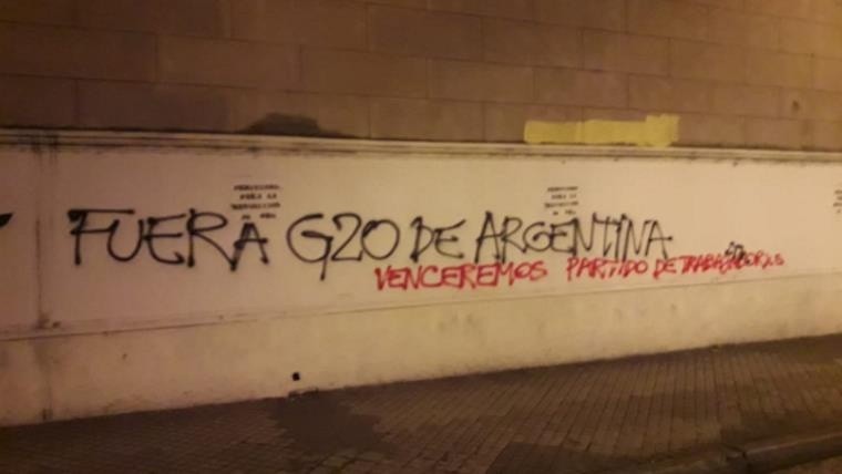 Luego, el personal se dirigió a Córdoba y Buenos Aires donde entrevistaron a Patricio Z. (43) quien contó que mientras estaba realizando la custodia de un edificio de la zona observó a los demorados que estaban realizando pintadas sobre la catedral, señalando una pared donde rezaba “Fuera G-20 de Argentina” en negro y “Venceremos Partido de Trabajadores” en rojo.