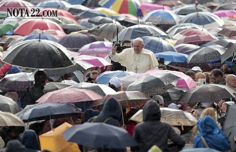 Sin la protección de un paraguas o de una capucha, Su Santidad recorrió la plaza abarrotada (se calculan unas 100 mil personas, número que se repite todas las semanas) saludando y bendiciendo, antes de subirse al estrado desde donde encabezó su tradicional audiencia de los miércoles.