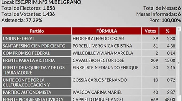 Lo más llamativo es que, por ejemplo, en los datos cargados de las seccionales de la capital provincial aparecen los nombres de Miguel Cappiello, Héctor Cavallero y Anita Martínez que son candidatos de la ciudad de Rosario. La primera pregunta sería: ¿es un error en el tipeo de los nombres? o ¿se cargaron votos de ellos en la ciudad de Santa Fe?. Si se cargaron votos de Rosario en Santa Fe ¿a dónde fueron a parar los votos de los candidatos santafesino?